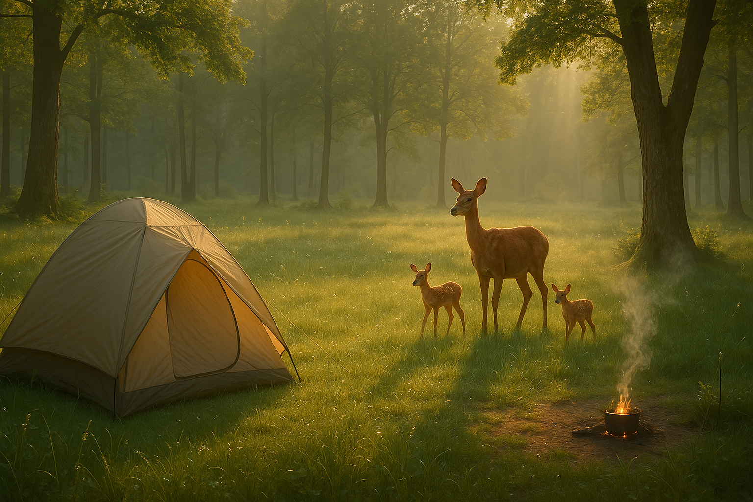 In het Baarnsche Bos kondigt de zomertijd zich stilletjes aan. Een hert en haar jongen baden in de ochtenddauw, terwijl kampeerders ontwaken in het zachte licht. Tussen parelend gras en geurige koffie lijkt de tijd stil te staan. De natuur volgt haar eigen ritme, los van de klok van de mens.